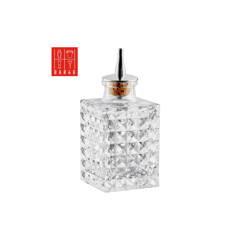 Bar46 Brand 100 ml Diamond Square Glass Bitter Bottle with stainless-steel dasher top – elegant, durable, and precise for professional mixology.