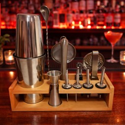 Professional 13 piece bartender set designed for fast, consistent cocktail service. Includes two weighted Boston shakers, Japanese jigger, strainers, muddler, bar spoon, ice tong, pourers, corkscrew, and a wooden holder—ideal for bars, hotels, restaurants, catering, events, and home mixology.