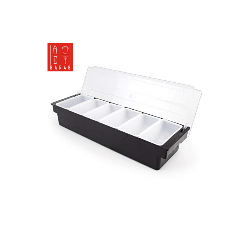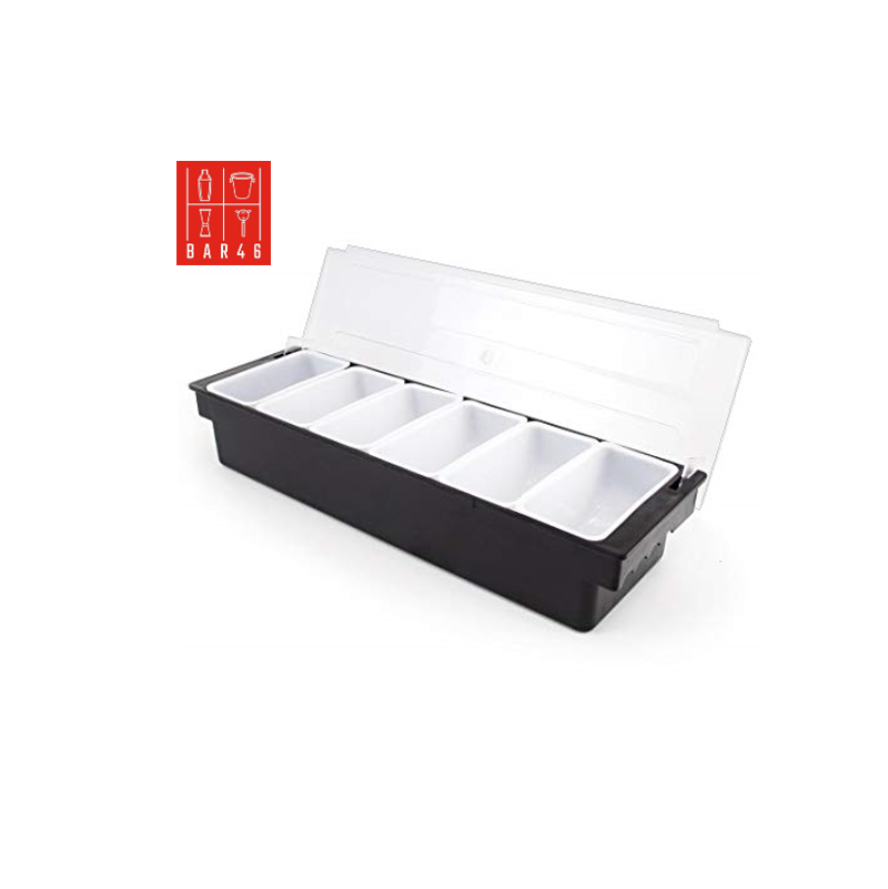 Bar46 Brand 6-Section Black Bar Condiment & Garnish Dispenser – durable, hygienic, and stylish tray for keeping garnishes fresh and organized.